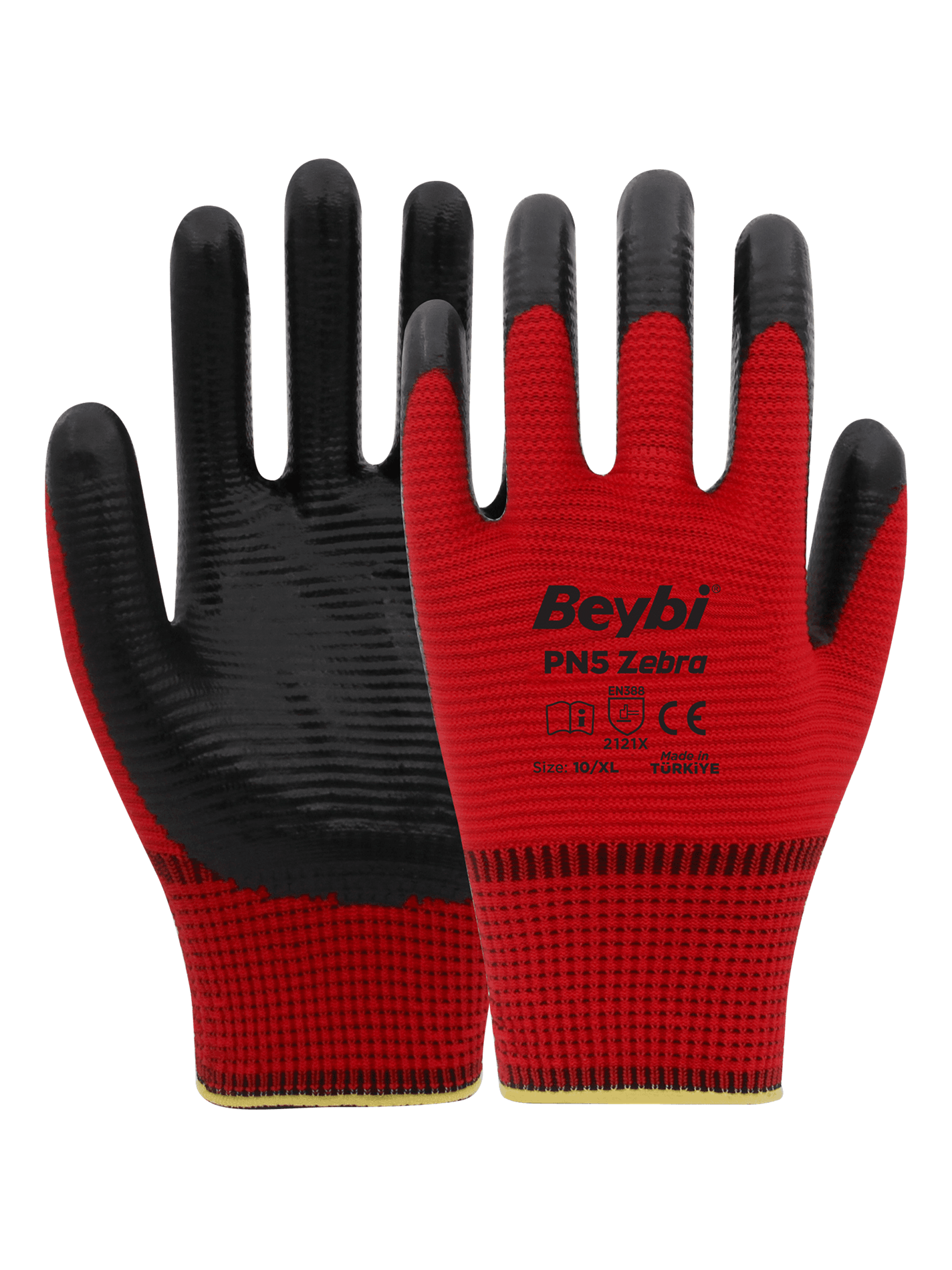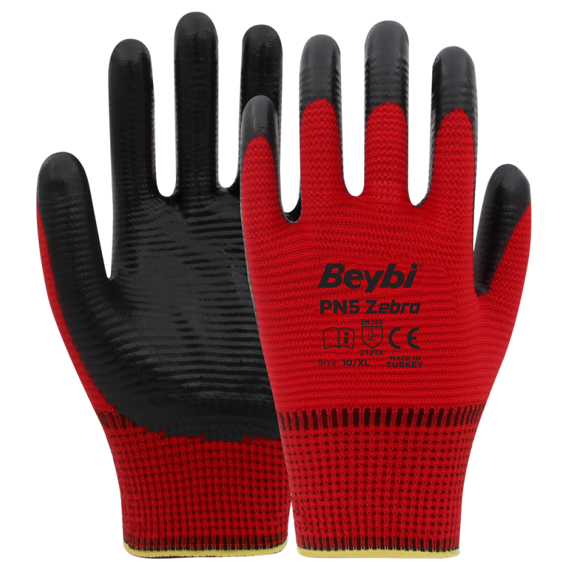 Beyaz, mavi veya kırmızı polyester iplikten örülmüş ve siyah nitril ile kaplanmış iş eldiveni.